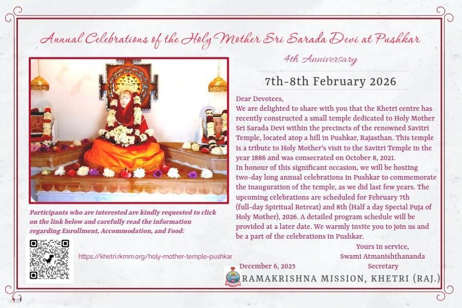Annual Celebrations of the Holy Mother Sri Sarada Devi at Pushkar