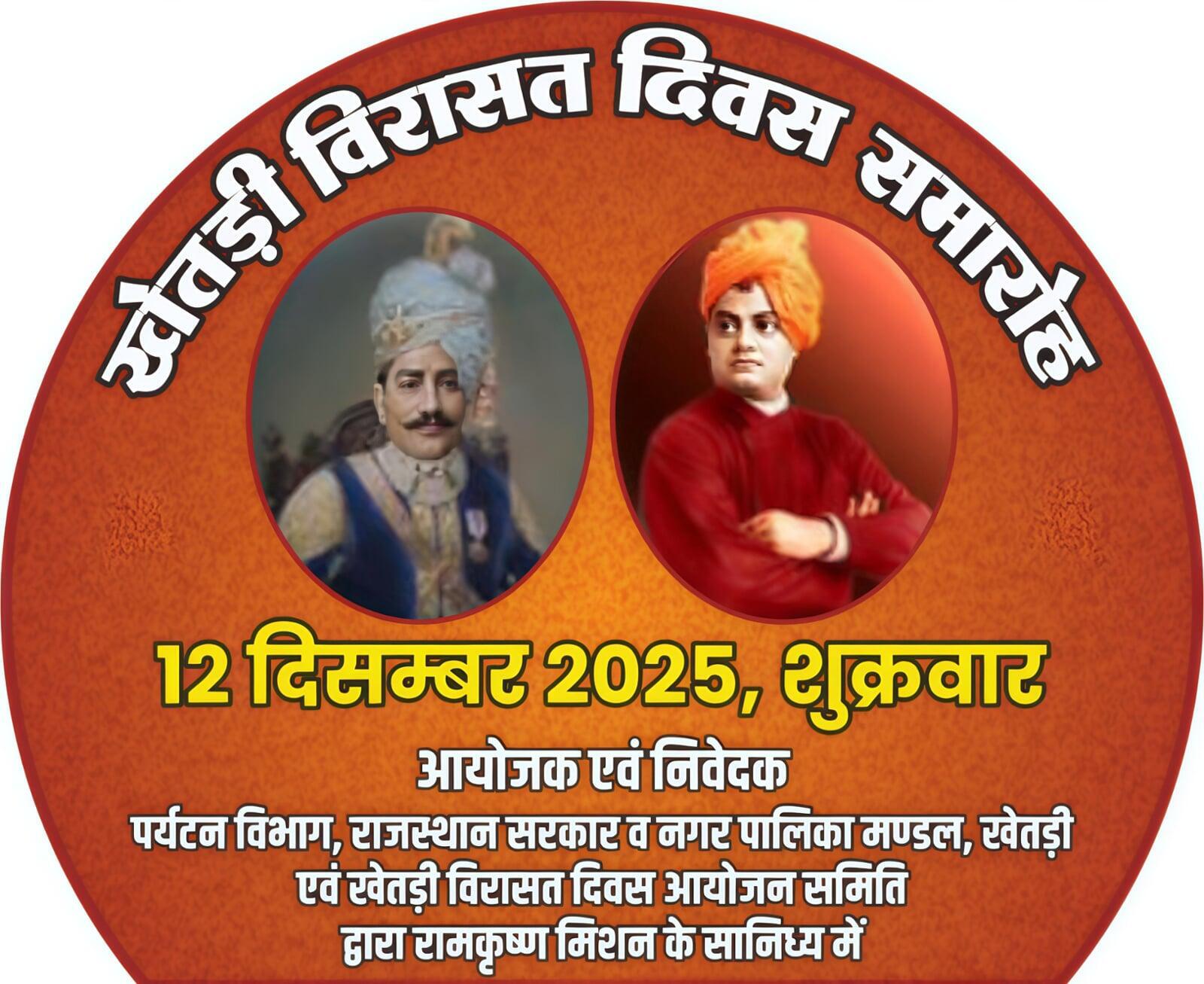 Khetri Heritage Day is celebrated every year on December 12th, commemorating Swami Vivekananda's third visit to Khetri in 1897 and his friendship with Raja Ajit Singh. The day is celebrated with great fanfare in the city, with a public reception, cultural programs, and tableaux. Significance: This day is dedicated to Swami Vivekananda's visit to Khetri on December 12th, 1897, and his deep friendship with Raja Ajit Singh Bahadur. Celebration: This day has been celebrated as an annual event since 2011, at the behest of the Ramakrishna Mission, Khetri. Event: A grand welcome and cultural programs are organized on this occasion. The entire city is decorated, and tableaux depicting Swami Vivekananda and Raja Ajit Singh are taken out on a city tour. Objective: The purpose of this event is to perpetuate the memories of Swami Vivekananda and Raja Ajit Singh and to promote Indian culture.